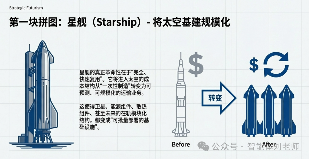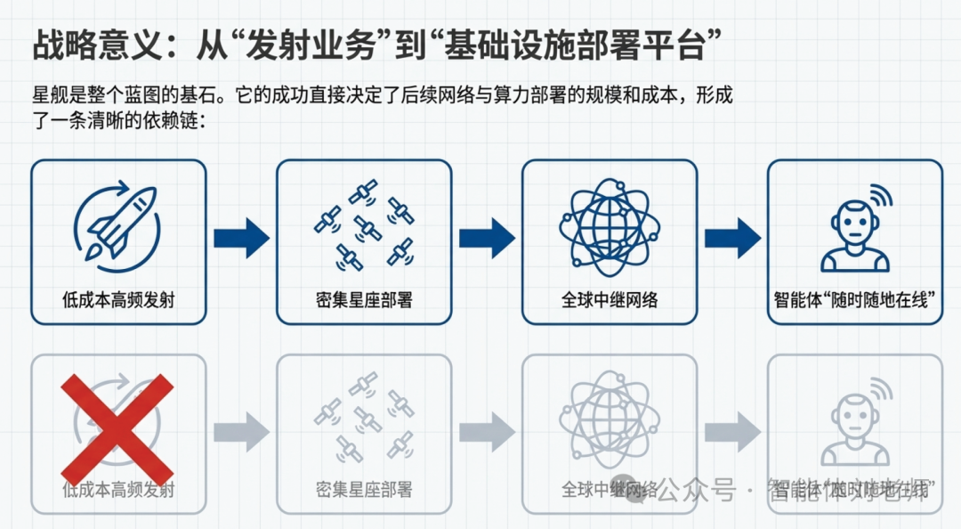 在"智能体互联网"语境下,星舰的价值不只是一枚火箭,而是把卫星、能源组件、散热组件、甚至未来的在轨模块化结构变成"可批量部署的基础设施"。只有当发射频次上来、边际成本下来,低轨星座才能从"通信业务"升级为"全球基础设施层"。