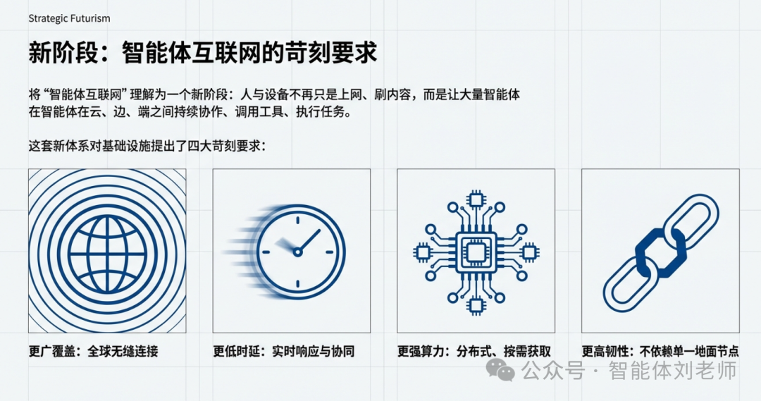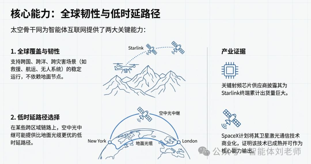 全球覆盖与韧性:当智能体需要跨国、跨洋、跨灾害场景运行(救援、航运、无人系统),骨干中继越不依赖地面节点,网络韧性越强。