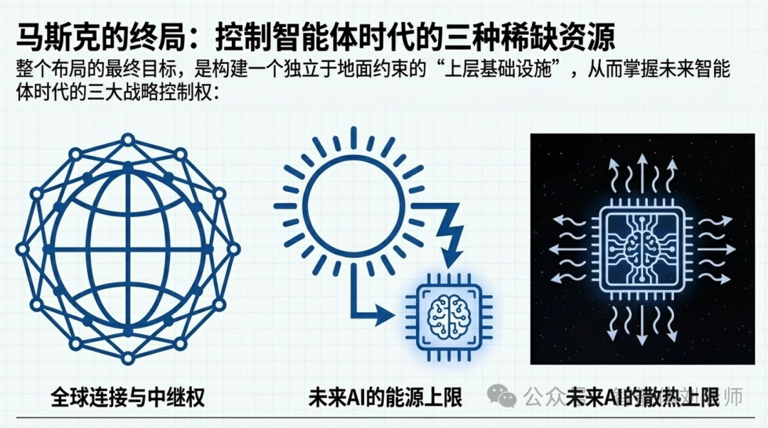 这三者一旦闭环,他就不仅在卖"火箭""卫星网",而是在构建一个相对独立于地面约束的"上层基础设施"------它可以跨越地缘政治的光缆瓶颈、绕开局部电力与冷却限制,并在全球范围内对智能体提供近乎"随取随用"的连接与算力。