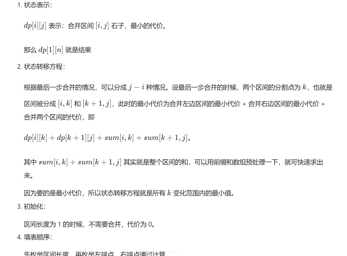int t = sum[j] - sum[i - 1]; // 算[i,j]石子总质量(最后一步合并的代价)