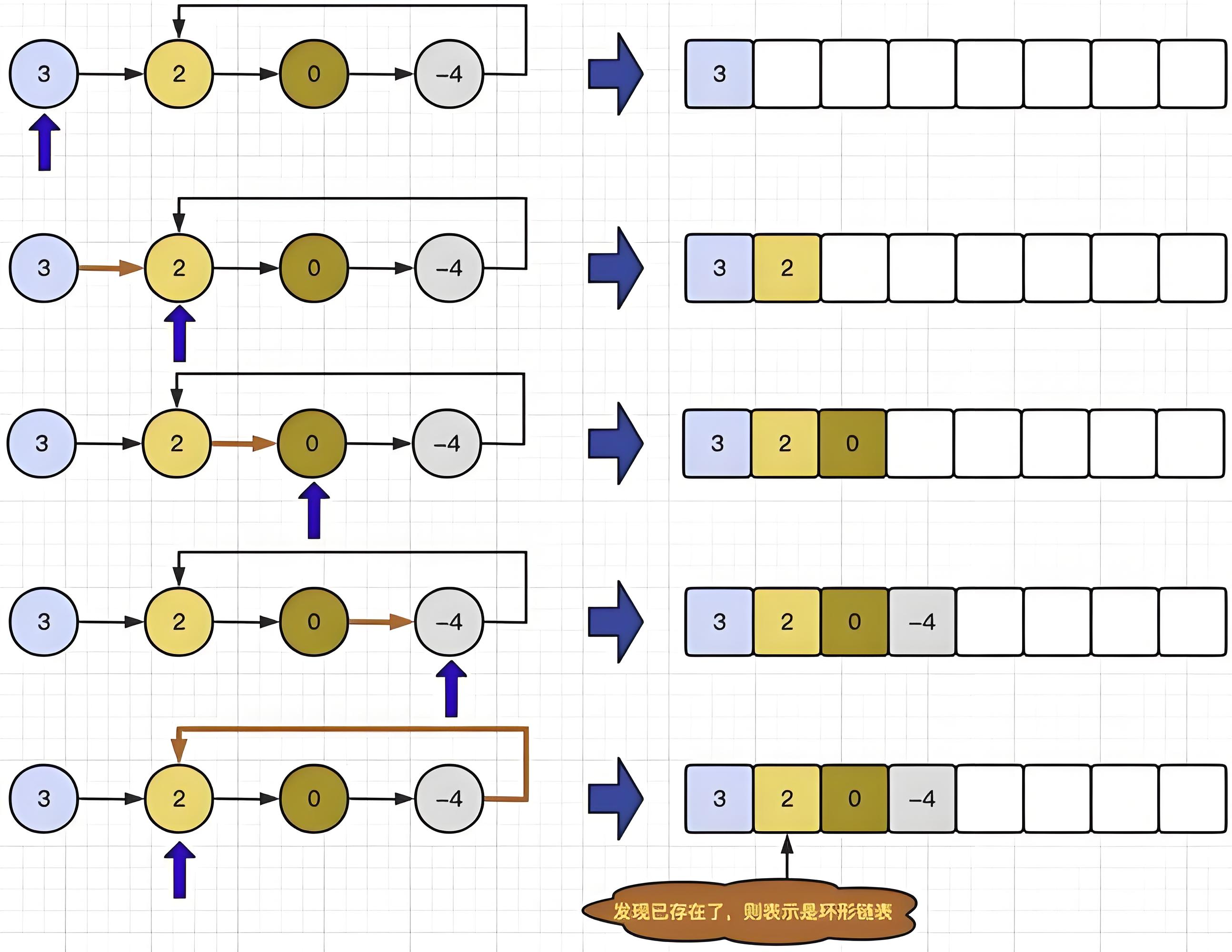 if (visited.contains(head)) // 如果当前节点已经在集合中出现过,说明存在环