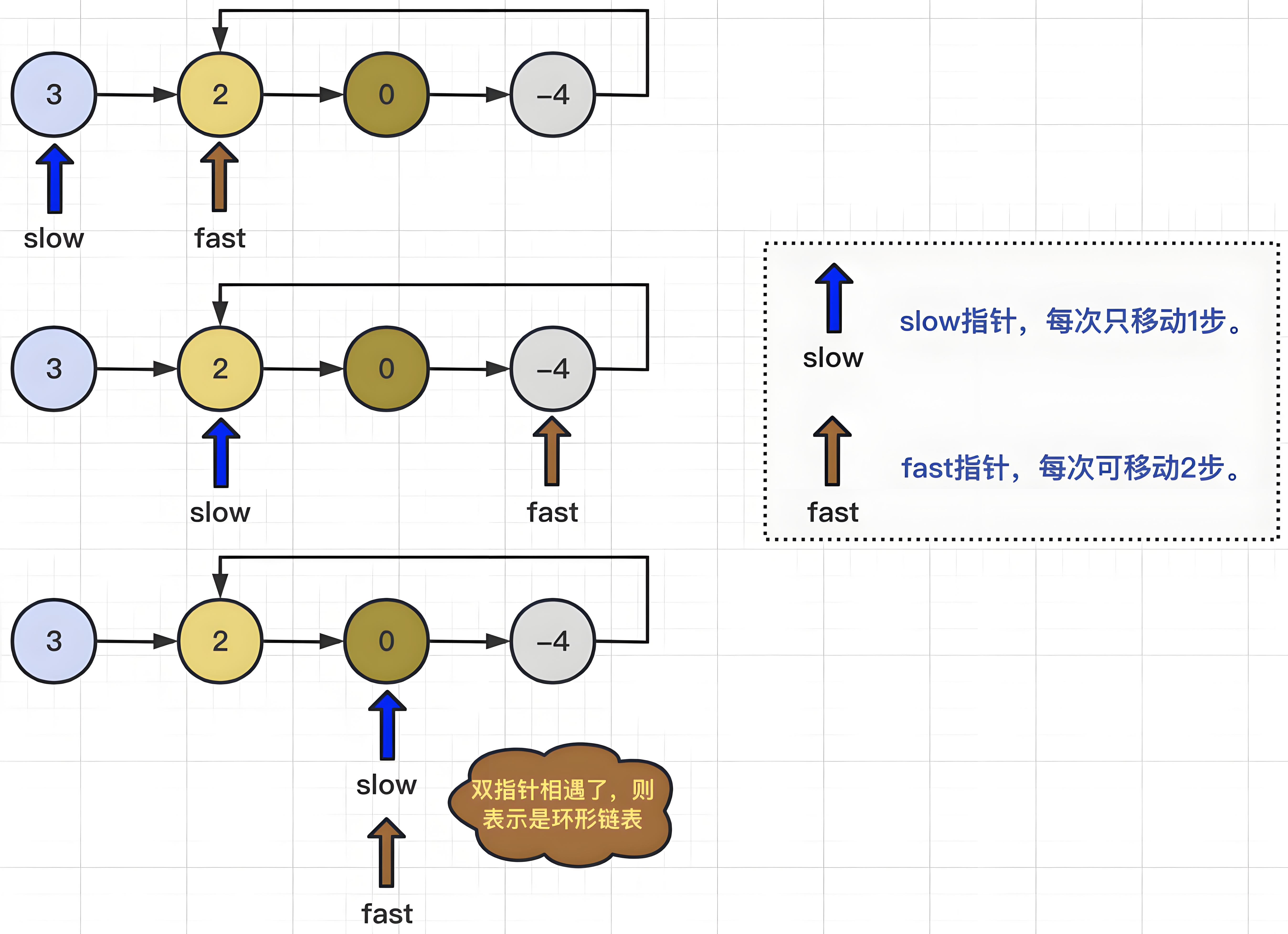 检测环:在移动过程中,如果快指针和慢指针相遇了(即它们指向了同一个节点),则说明链表中存在环。如果快指针在某一步到达了链表的末尾(即指向了空节点),则说明链表中不存在环。