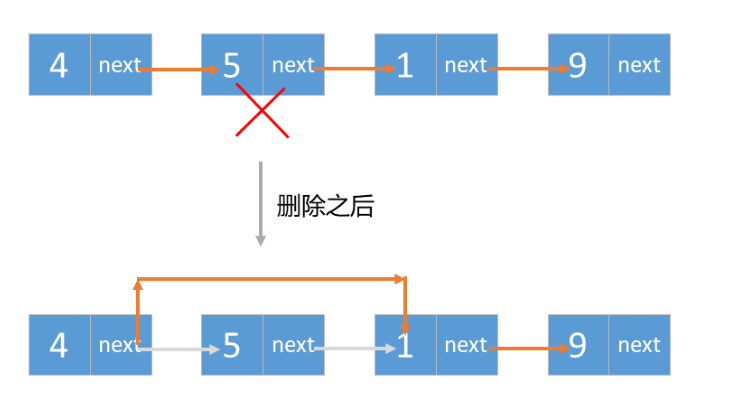 定位节点: 遍历链表,直到 head.val == val 时跳出,即可定位目标节点。 修改引用: 设节点 cur 的前驱节点为 pre ,后继节点为 cur.next ;则执行 pre.next = cur.next ,即可实现删除 cur 节点。
