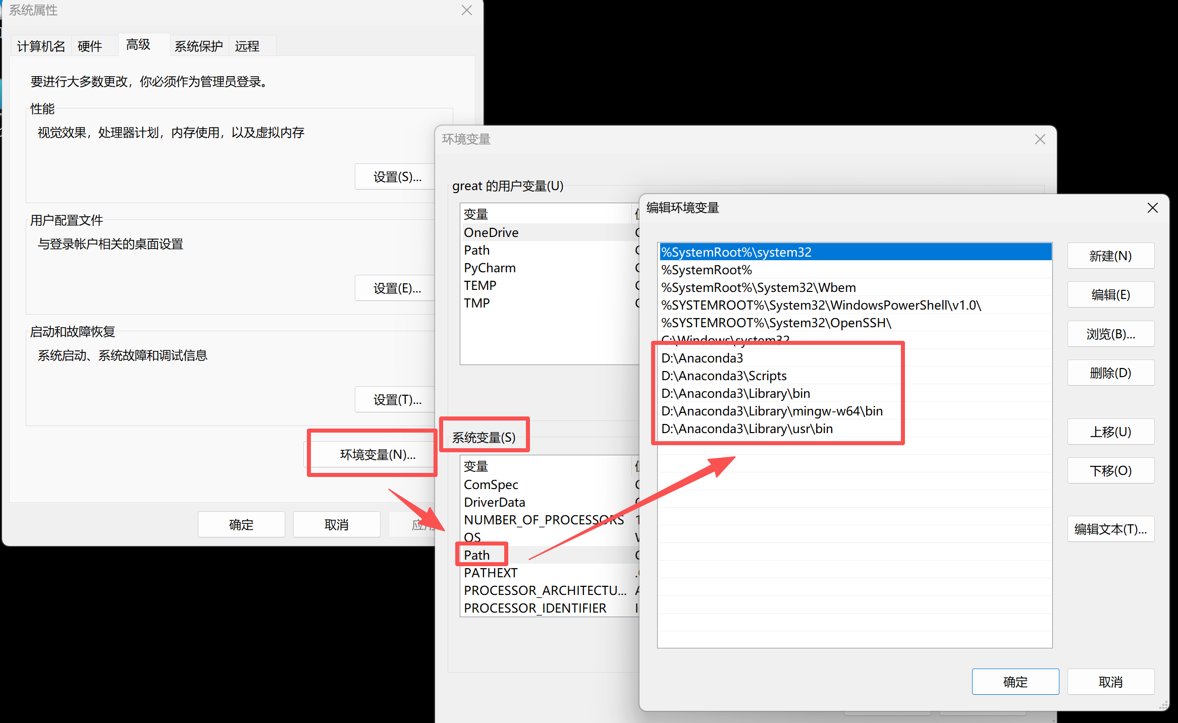在系统变量中添加路径,具体为Anaconda的实际安装路径。