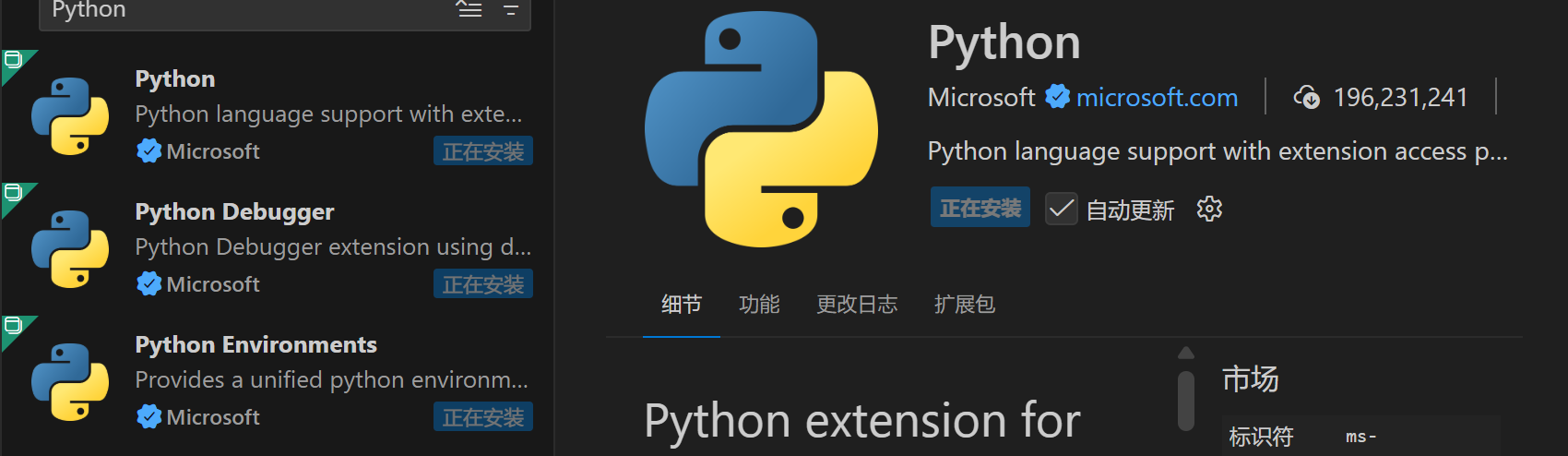 在扩展栏搜索并安装Python插件。(在扩展栏搜索Chinese可以更换为中文版)