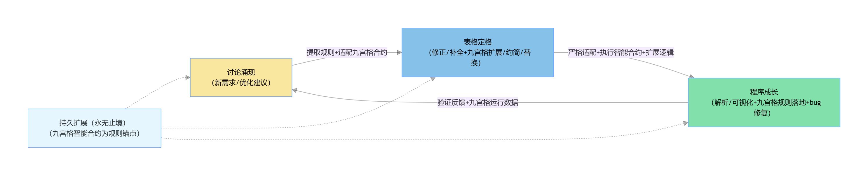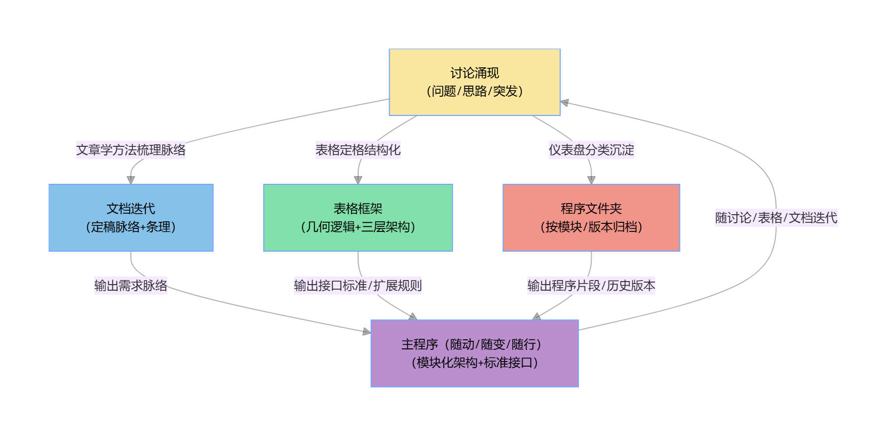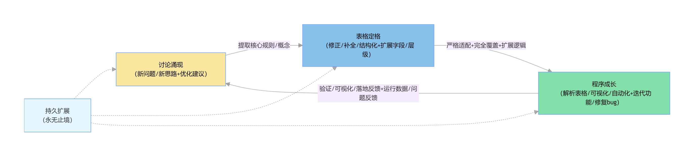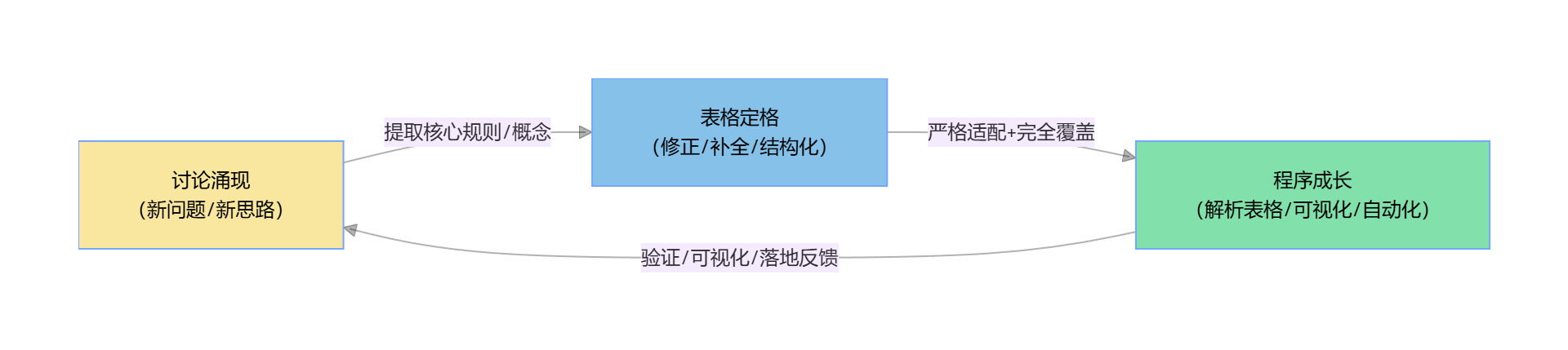 核心逻辑闭环:讨论(涌现)→ 表格(定格)→ 程序(成长)→ 反哺讨论(新涌现)