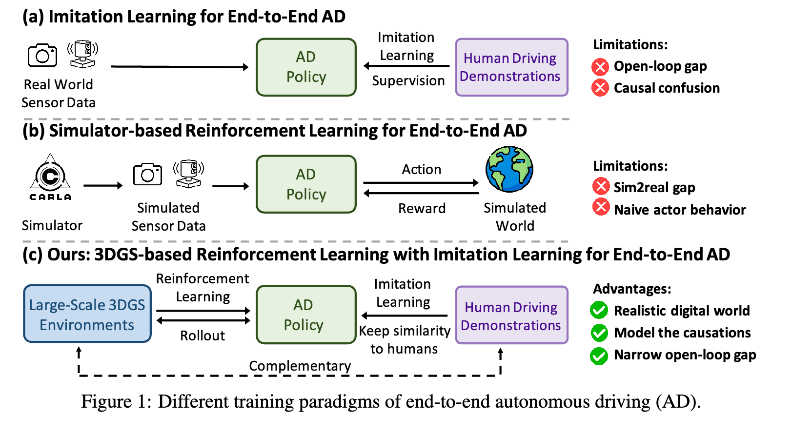 RAD提出了首个基于3DGS的闭环强化学习框架,用于训练端到端自动驾驶策略。