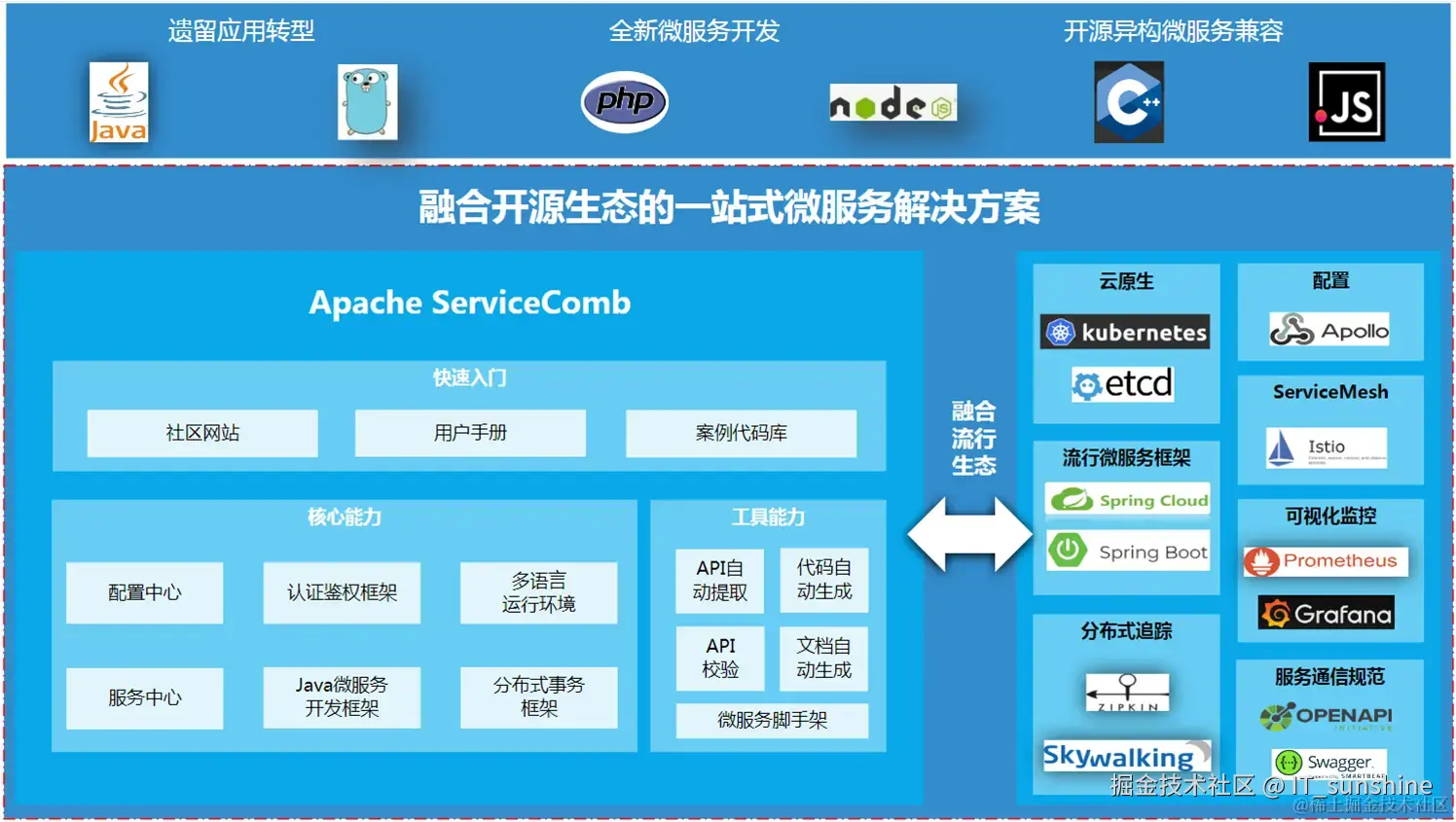 核心架构特点:采用分层设计,将服务治理能力与业务代码解耦,支持REST、RPC等多种通信协议,适配单体迁移、全新开发等多种微服务落地场景。