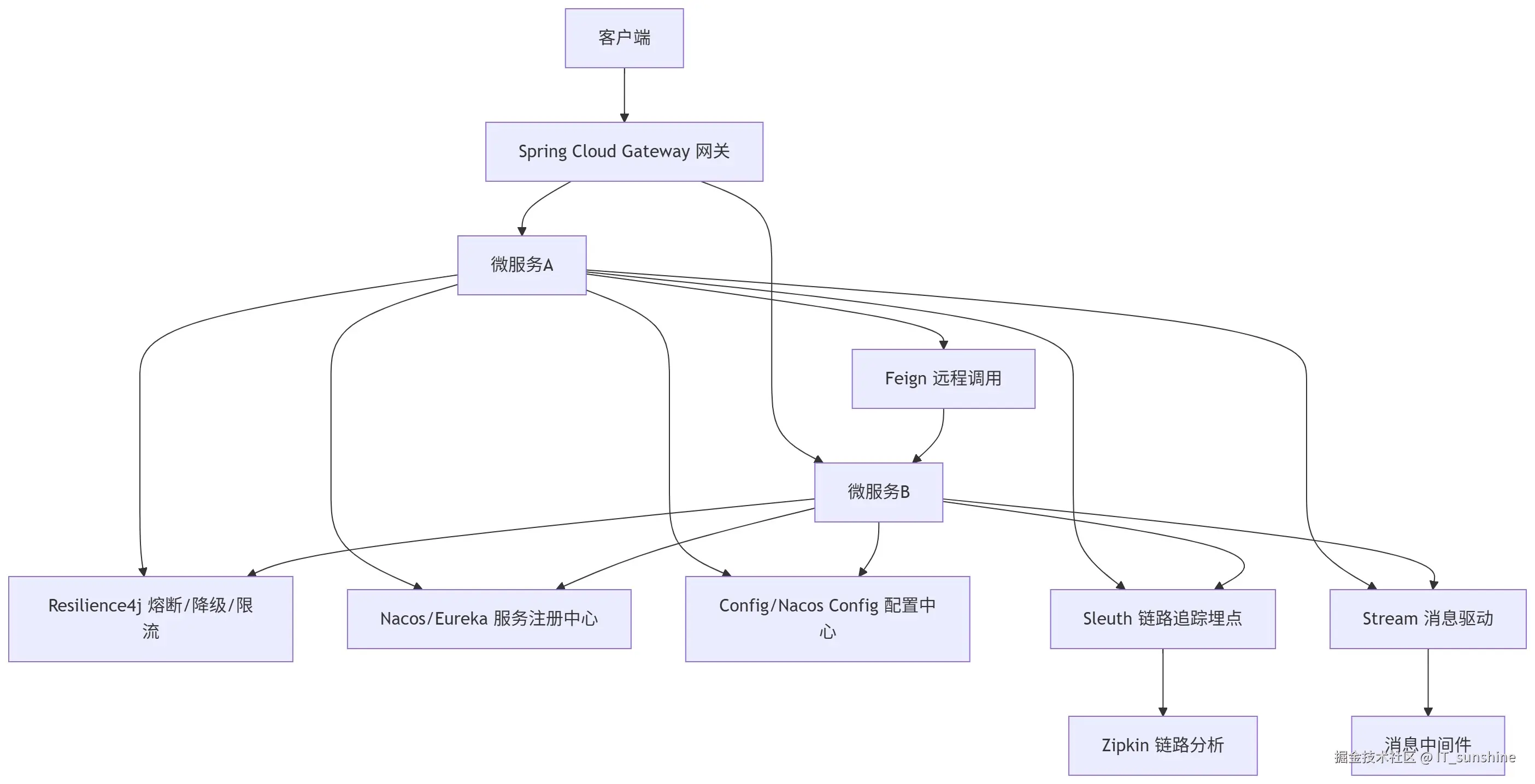 Spring Cloud并非单一框架,而是基于Spring Boot的微服务生态集合,核心遵循"约定优于配置"原则,通过一系列组件实现服务治理全流程。其核心架构如下: