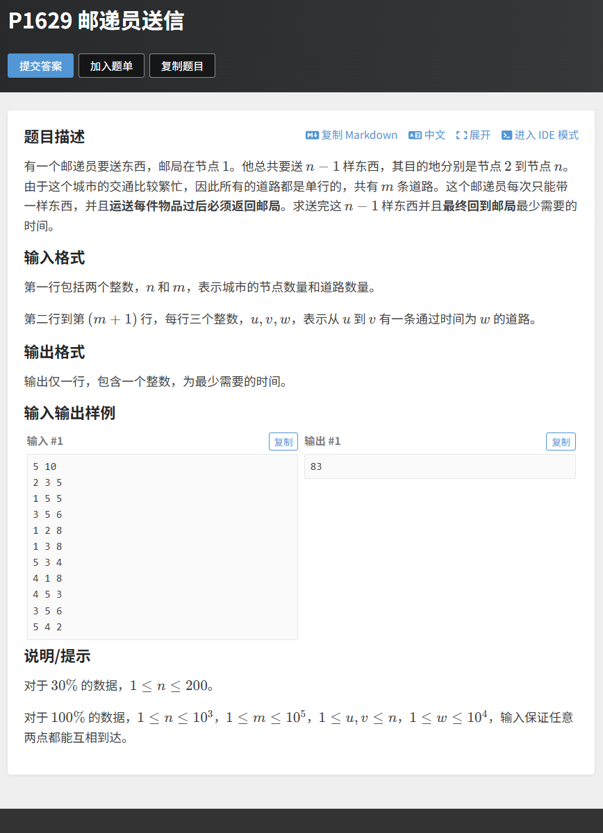 题目链接:P1629 邮递员送信