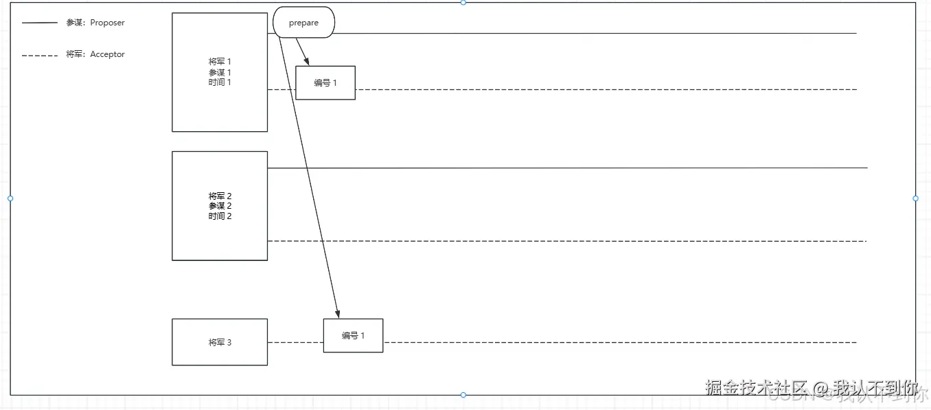 1、Proposer(参谋 1)向半数以上 Acceptor(将军 1、2、3)发送带提案编号N(编号 1)的Prepare请求,但是某个 Acceptor(将军 2)请求超时或者丢失(被敌军拦截)