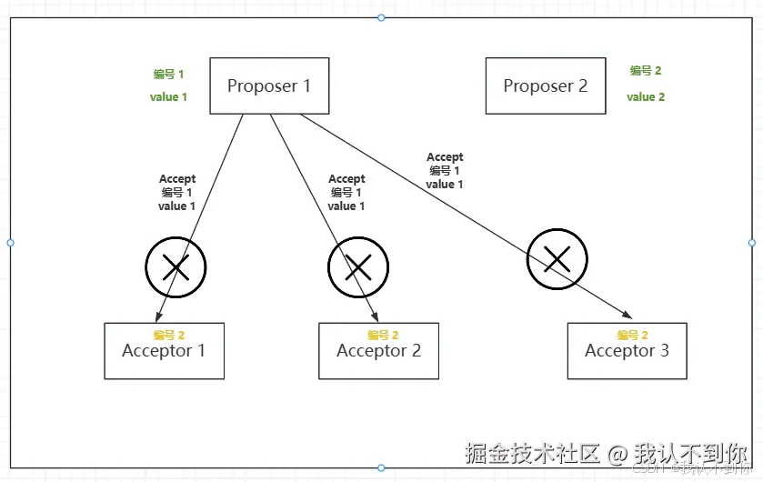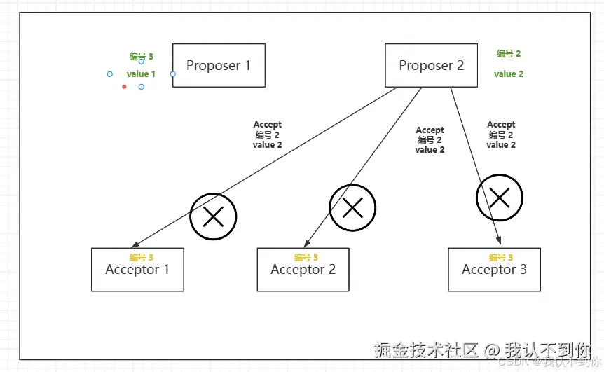 5、那么 Proposer 2 发送带 编号 2 和 value 2 的 Accept 提案,就行不通了