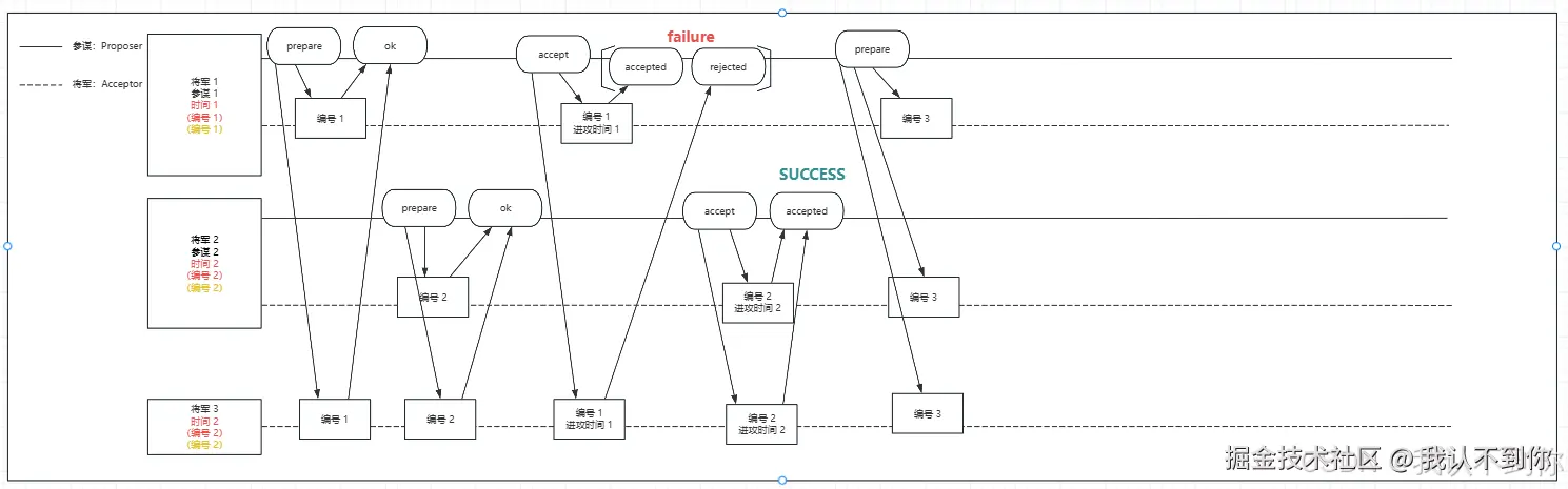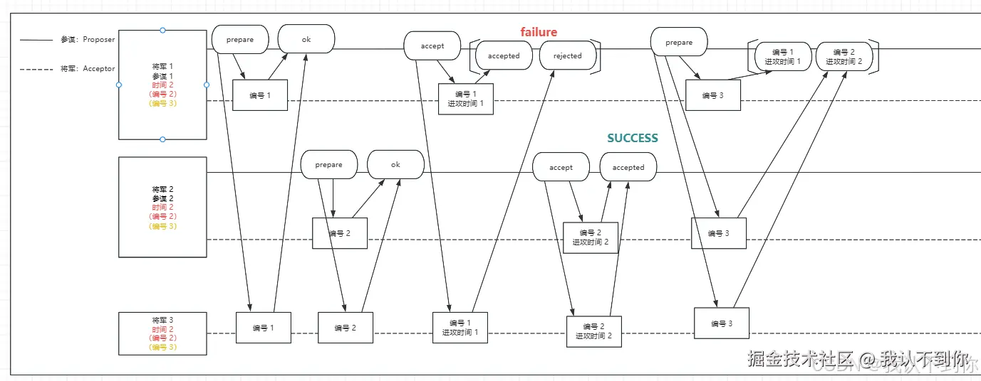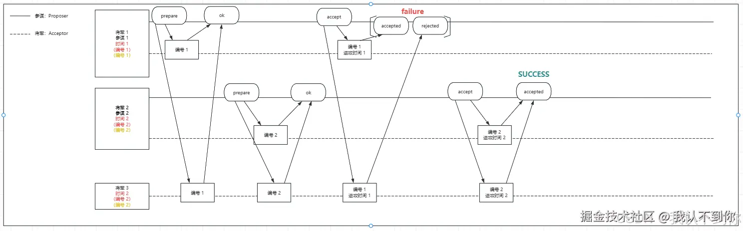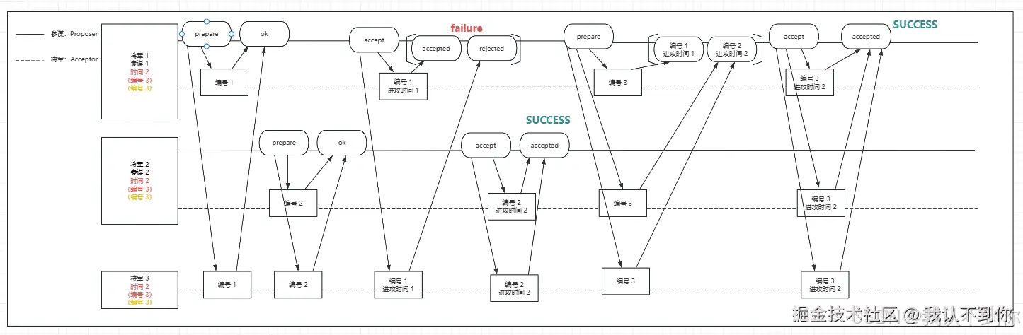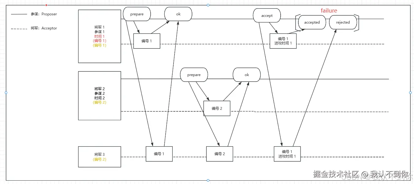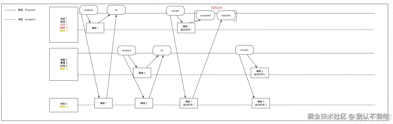 由于三个节点只有一个成功,不符合多半以上节点同意提案,该请求失败(failure),Proposer(参谋 1)后续还会发请求