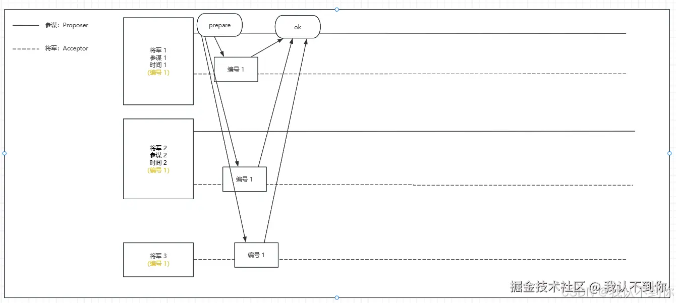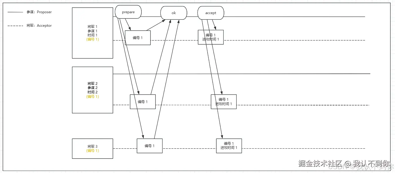 将军(Acceptor,就是接受者)可以有参谋(Proposer,就是提案者),暂时不管Learner