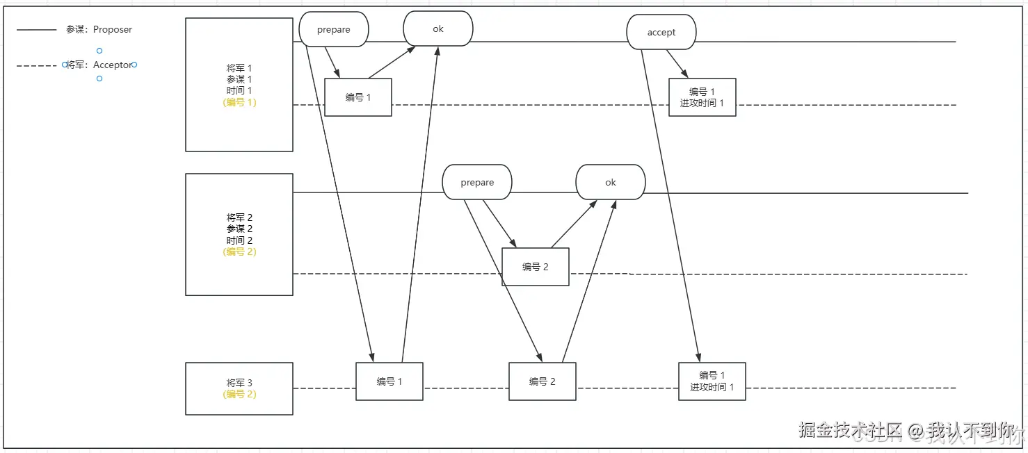 参谋(Proposer)派出的通信兵(啥也不是,就是起一个通信作用)都会携带自增长的提案编号(N)