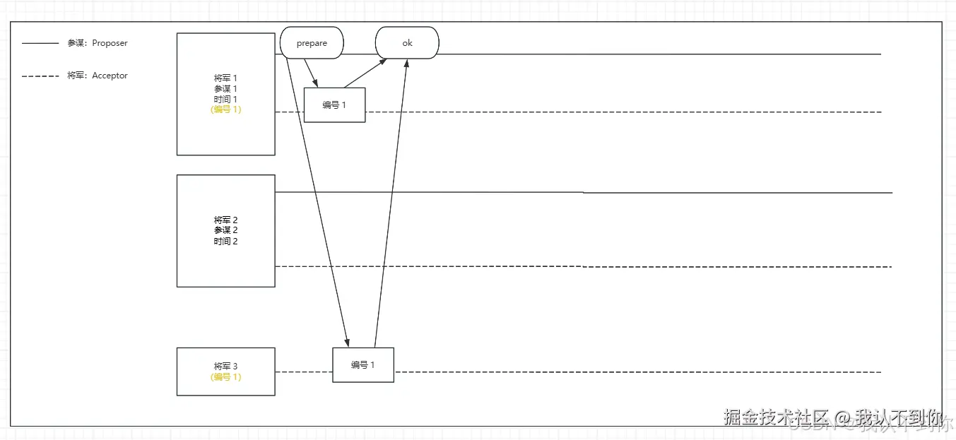 1、Proposer(参谋 1)向半数以上Acceptor(将军 1、2、3)发送带提案编号N(编号 1)的Prepare请求