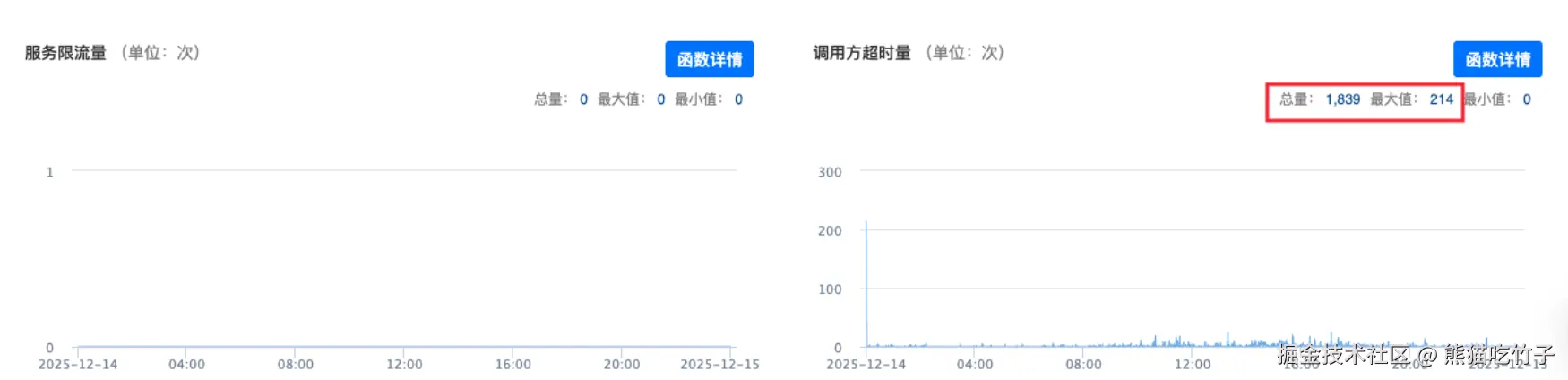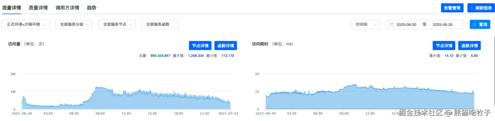 在沙箱环境中,统计工具每5分钟聚合一次检索接口的性能数据,重点关注 P99、P99.9、P99.99、P99.999高分位耗时以及最大耗时(Max)。从统计结果可以看到,在 10:25 时间点接口耗时出现明显抖动,多项高分位指标均超过了 230ms 的超时时间阈值 。