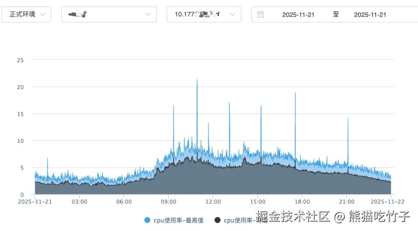 下图是一台站内服务的实例,平时CPU基本都维持在不超过10%,但是一天会有几次突刺。而且发现CPU的突刺和接口超时是比较吻合的,于是就朝着优化CPU突刺的方向思考。