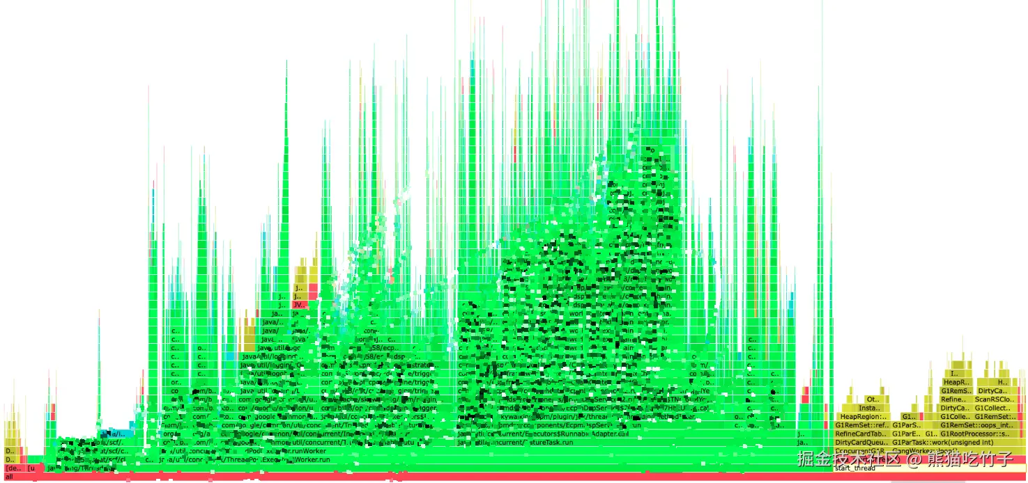 CPU突刺的火焰图(右侧红色和黄色为G1GC相关信息)