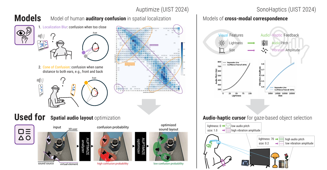 Auptimize系统通过计算模型预测这些混淆概率,利用整数规划算法自动调整虚拟声源的位置。实验证明,这能减少 25.2% 的感知错误。 - 跨模态反馈 (SonoHaptics): 当视觉被占用时,系统可以利用感官映射。例如,将颜色的亮度映射为音频音调的高低,将物体的大小映射为触觉振动的强度。这让用户在不看屏幕的情况下,仅凭听觉和触觉就能精准选择物体(准确率提升 16.3%)。