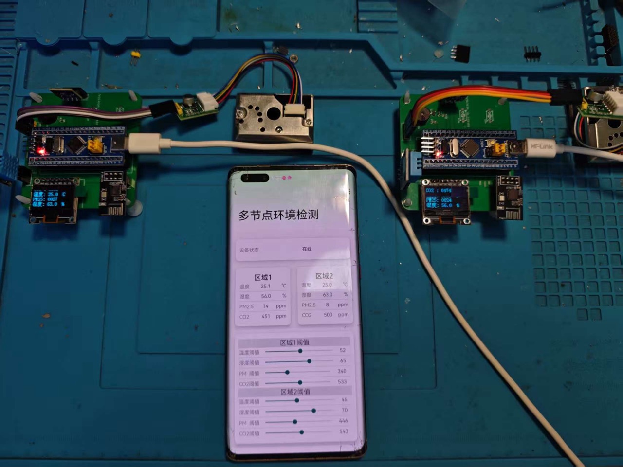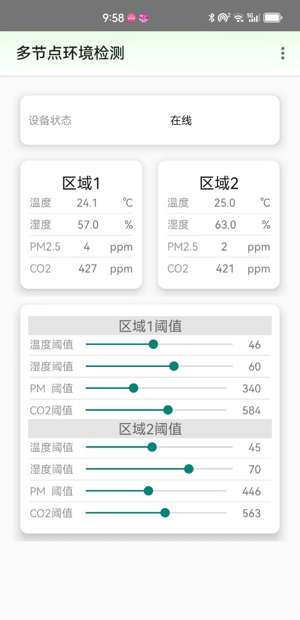 3.会提供两个区域的温湿度、pm2.5和co2浓度独立显示和控制