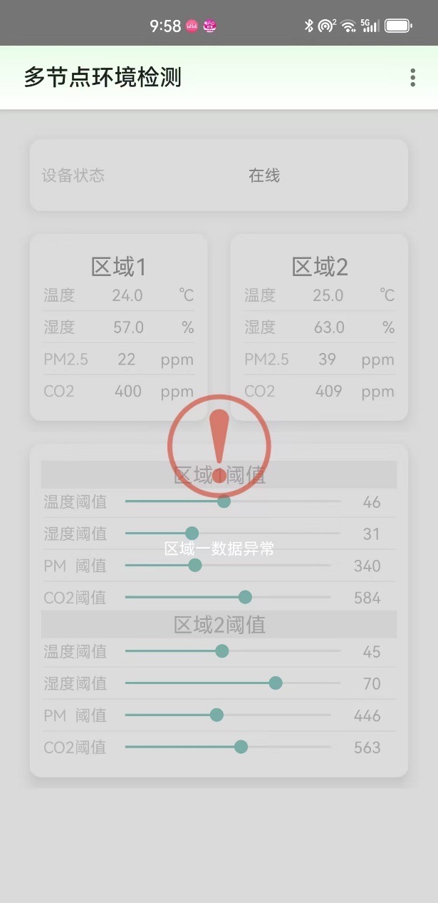 4.可以设置各个传感阈值,以达到报警提醒的效果可以远程查看数据是否超标,界面会出现提示信息;
