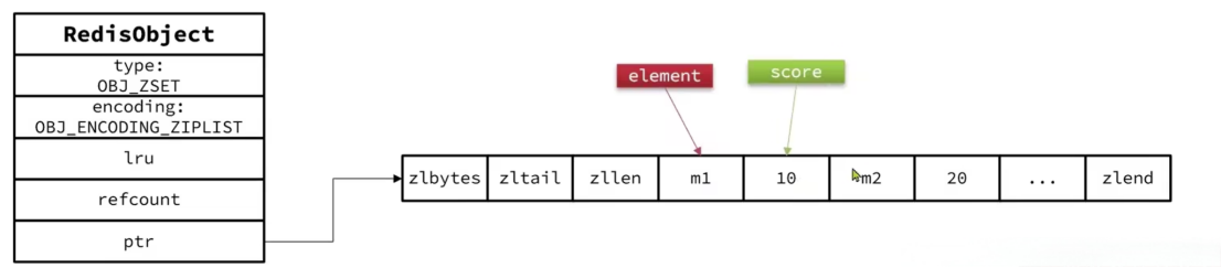 ziplist本身没有排序功能,因此score和element是紧挨在一起的两个Entry,element在前,score在后。