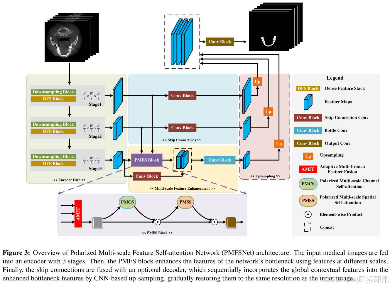 - 瓶颈层 (Bottleneck):在网络的最深处,使用 PMFS Block 捕捉最高层级的抽象语义信息。