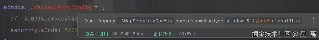 TypeScript 对 window 的类型有严格定义,默认的 Window 接口里没有 _AMapSecurityConfig,所以会提示 "该属性不存在"。但是高德地图又需要这个属性来配置安全密钥,所以我们就需要来扩展一下 window 类型。