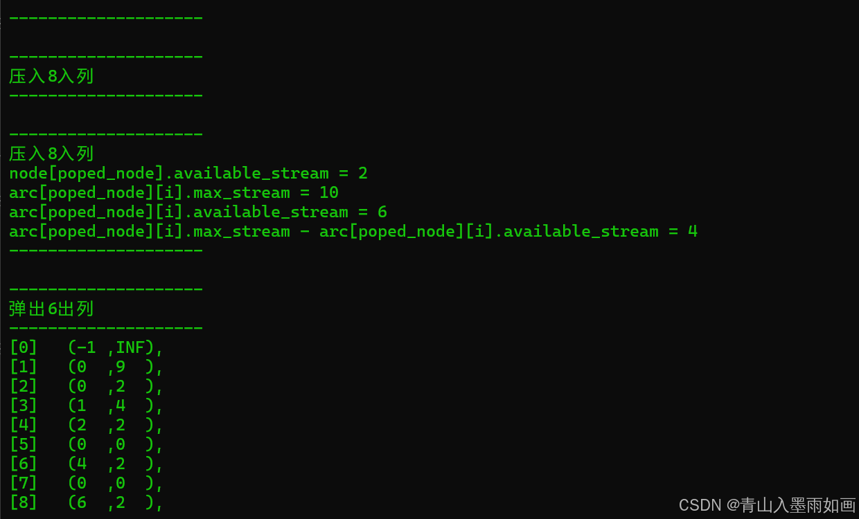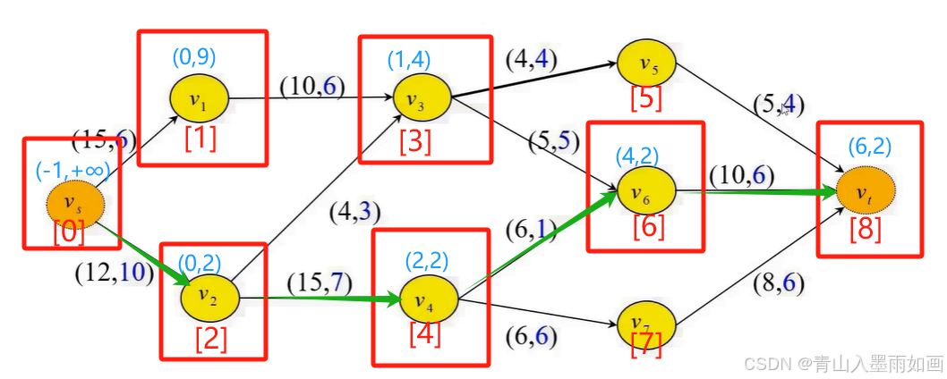 从node[max_node]。source_node回溯,依次是:node[8]::(6,2)->node[6]::(4,2)->node[4]::(2,2)->node[2]::(0,2)->node[0]::(-1,+∞),因此可以确定增广链: