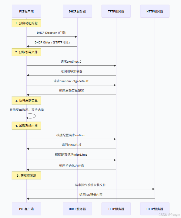 一个精心配置的启动菜单能极大提升批量装机的效率和体验。下面这张图清晰地展示了PXE启动的完整流程,你可以看到启动菜单(default文件)在这一流程中的关键位置: