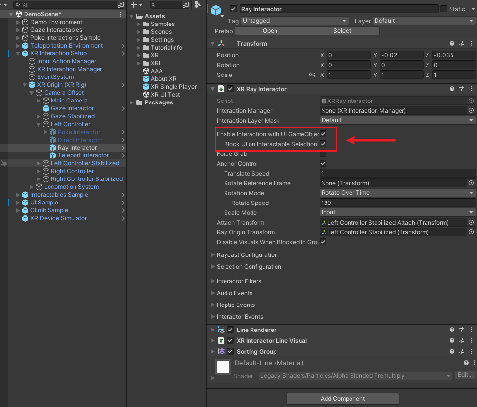 挂载到 UGUI的Canvas上,结合 EventSystem、XRUIInputModule ,可实现XR手柄的与UGUI中UI交互!