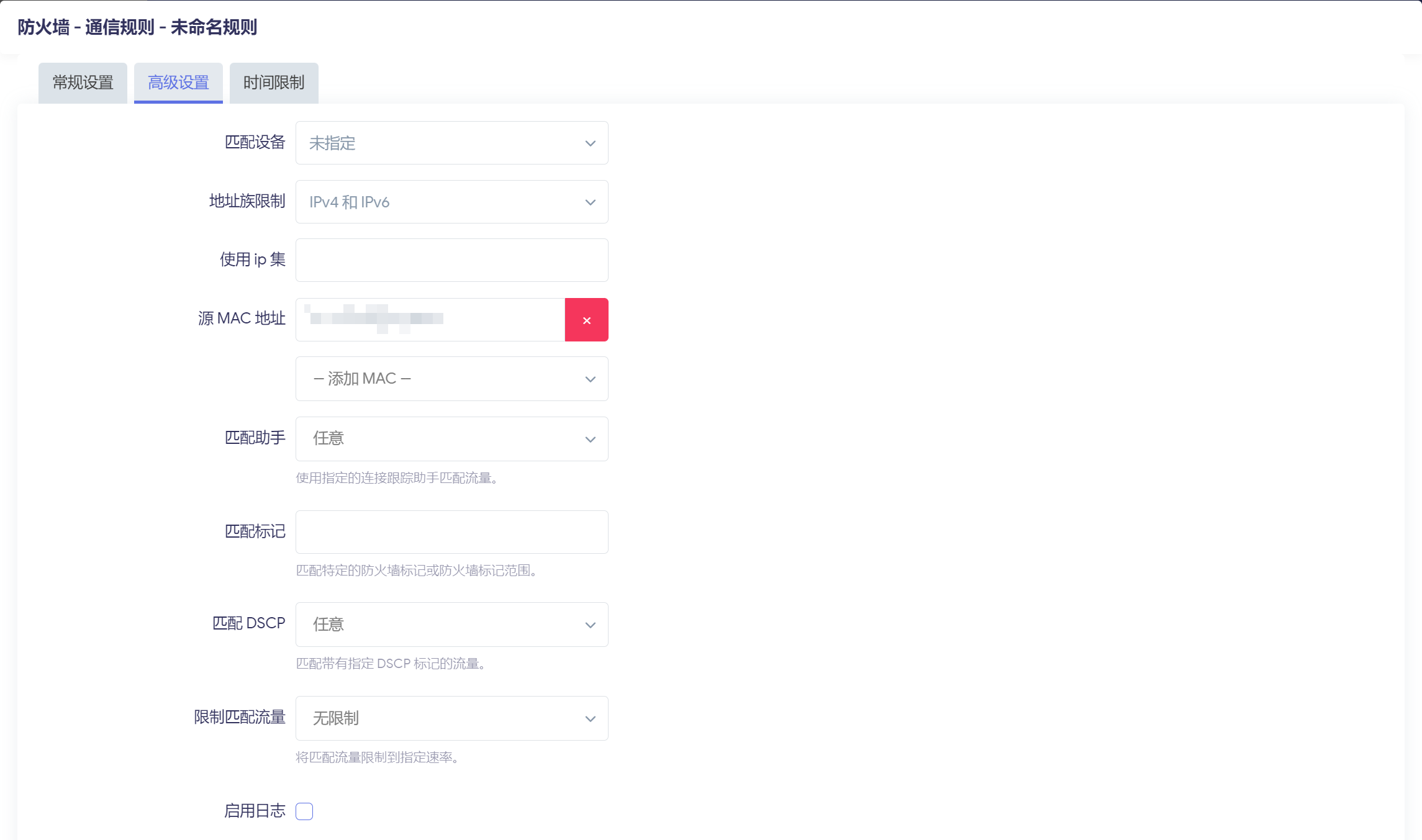 地址租限制选择IPv4 和 IPv6源 MAC 地址填写投影仪的 MAC 地址