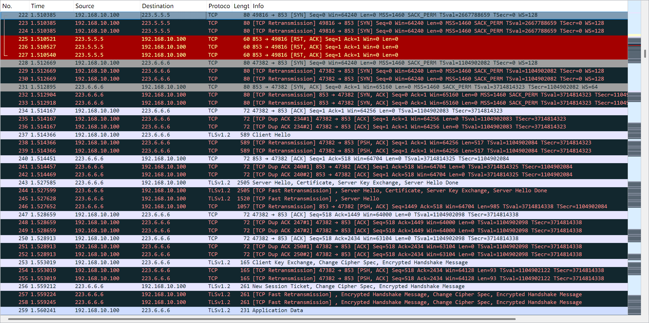 我们可以很快的发现,在访问网页的时候,会有向 IP 为 223.5.5.5 和 223.6.6.6 的 TCP 连接,同时使用的是 853 端口。