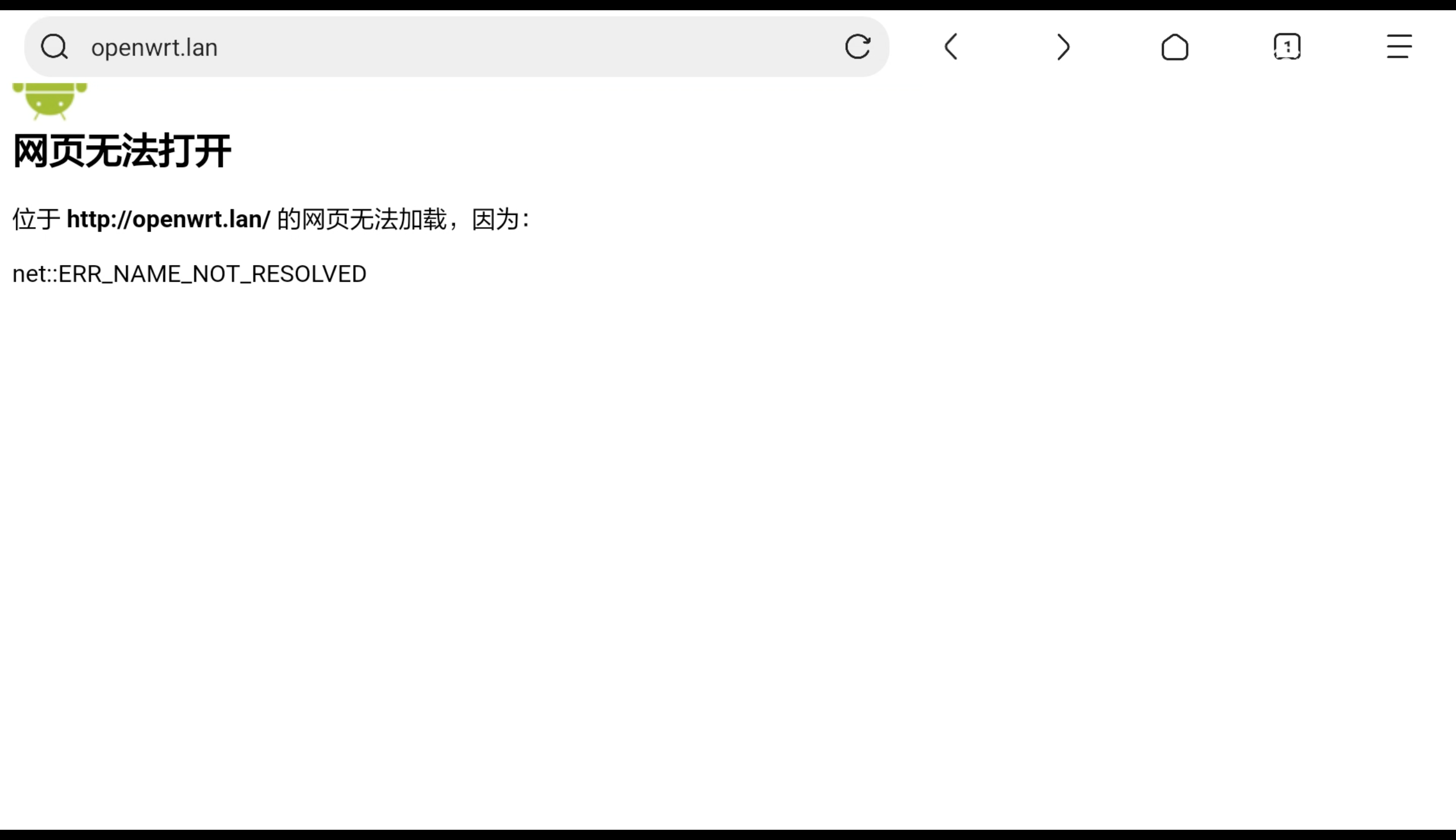 同时,我们使用浏览器进行访问 openwrt.lan,同样无法进行访问,并且提示 net::ERR_NAME_NOT_RESOLVED,同样告诉我们无法正常解析 openwrt.lan 的域名。