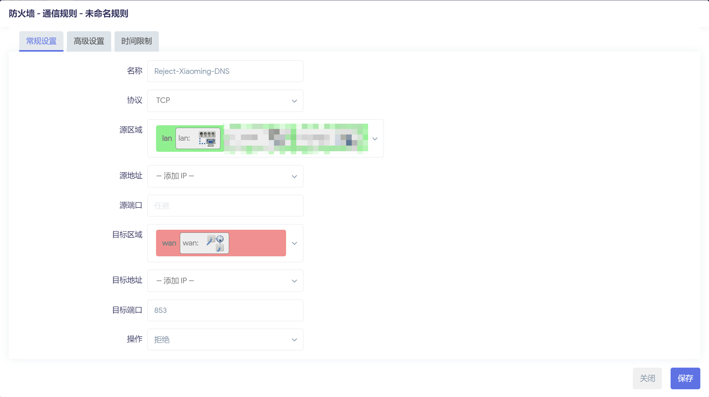 名称填写Reject-Xiaoming-DNS协议选择TCP源区域选择lan目标区域选择wan目标端口填写853操作选择拒绝