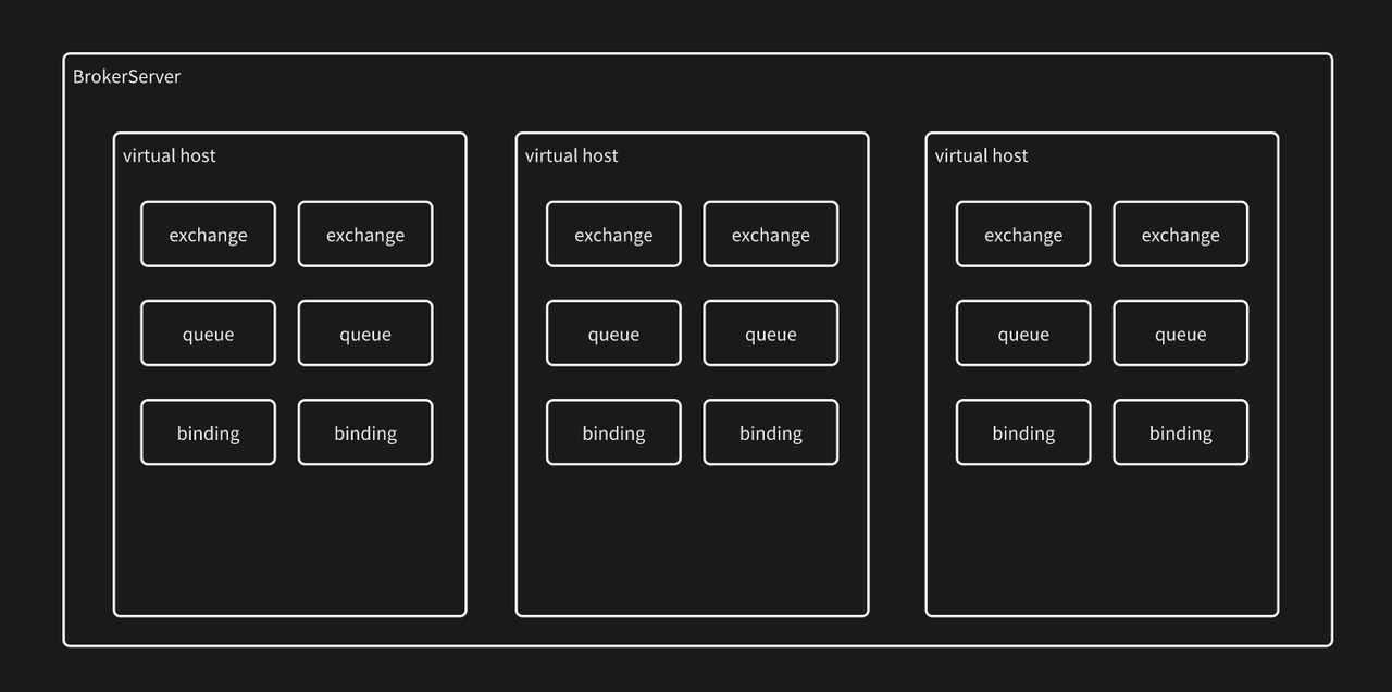 - 虚拟机 (VirtualHost): 类似于 MySQL 的 "database", 是一个逻辑上的集合。一个 BrokerServer 上可以存在多个 VirtualHost