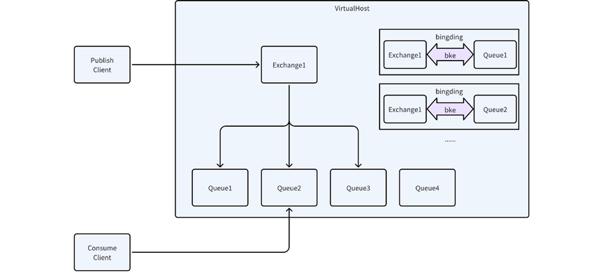 - 绑定 (Binding): Exchange 和 Queue 之间的关联关系,Exchange 和 Queue 可以 理解成 "多对多" 关系,使用一个关联表就可以把这两个概念联系起来