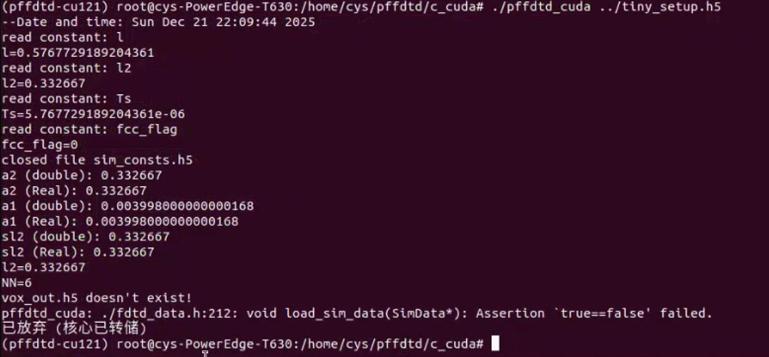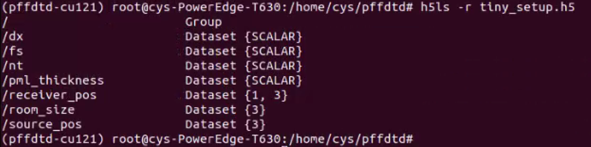 ⚠️ 注意:pffdtd_cuda 在找不到 input.h5 时,会回退到 内置默认空房间模型 ------ 但需显式传入 tiny_setup.h5 作为 setup 文件: