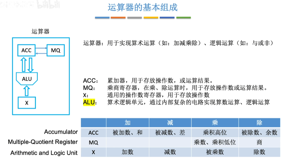 运算器的核心是算术逻辑单元(ALU)。运算器包含若干通用寄存器,用于暂存操作数和中间结果,如累加器(ACC)、乘商寄存器(MQ)、操作数寄存器(X)、变址寄存器(IX)、基址寄存器(BR)等。