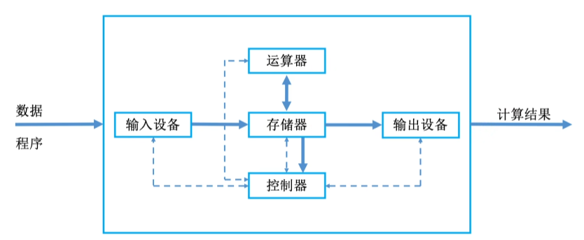 1945 年,冯·诺依曼中提出了冯·诺依曼体系结构,又称:存储程序计算机。即:程序本身是存储在主机内存中的,可以通过加载不同的程序来解决不同的问题。