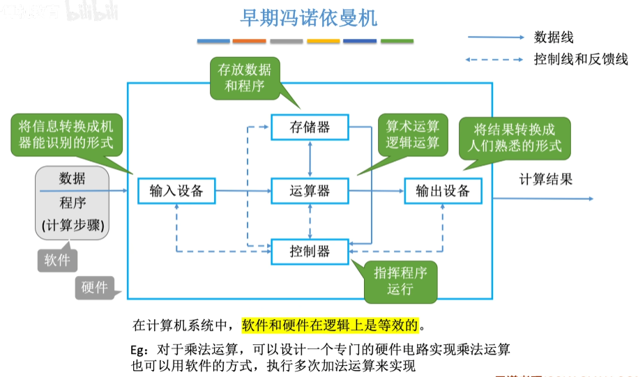 如果某一功能能被硬件实现也能被软件实现,在用户角度来看,它在功能上是等价的。这一等价性被称为软/硬件逻辑功能的等价性。(可查看3.计算机系统层次结构一栏的开头)