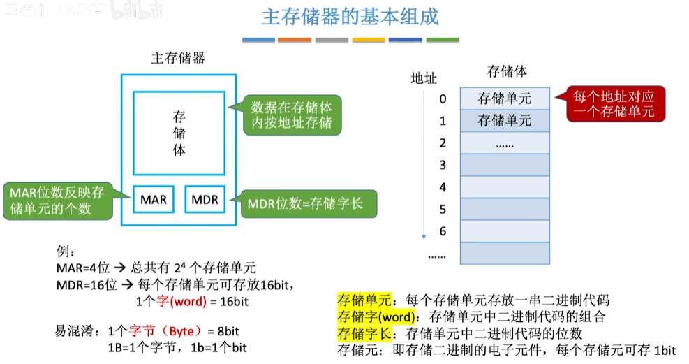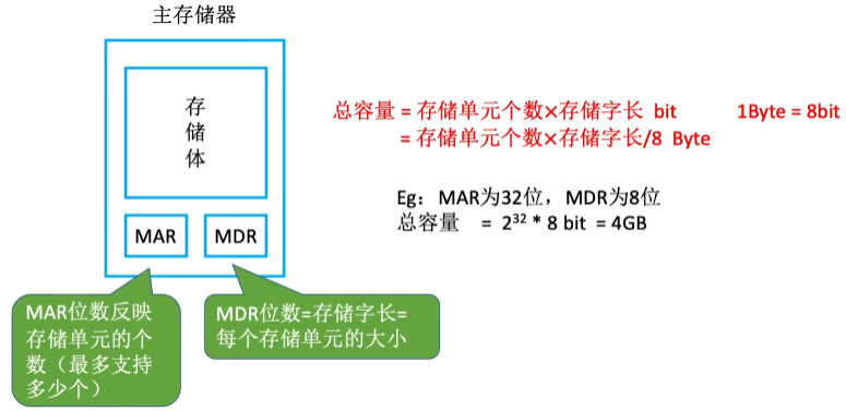 主存容量是指主存储器所能存储信息的最大容量,通常以字节来衡量,也可用字数×字长(如512K×16位)来表示存储容量。其中MAR的位数反映了存储单元的个数,MDR的位数反映了存储单元的字长。例如MAR位16位,表示216=65536,即此存储体内有65536个存储单元(可称为64K内存,1K=1024),若MDR为32位,则表示存储容量为64K×32位。