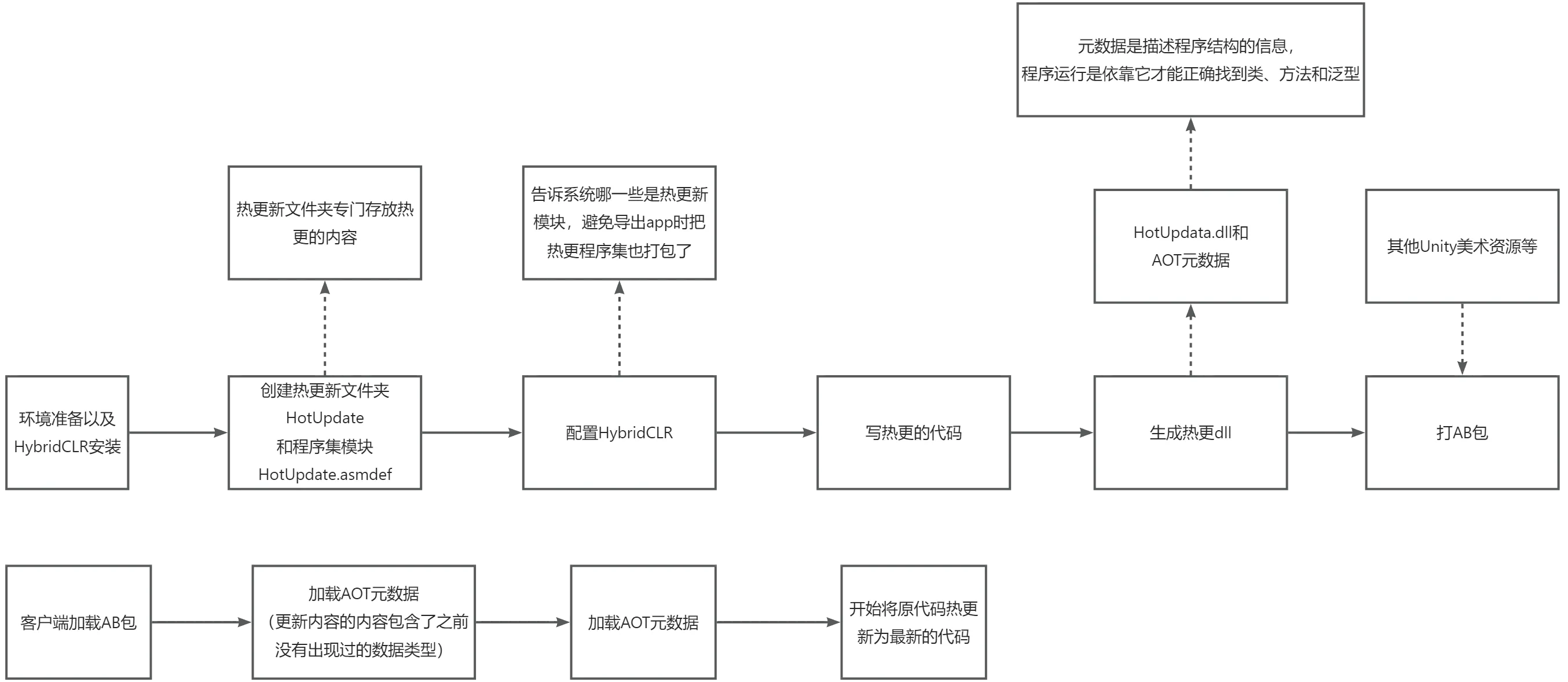 总结:HybridCLR可以将热更代码编译成.dll,并且会自动补充元数据。可以通过该框架去更新原本的代码内容。