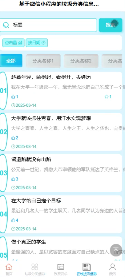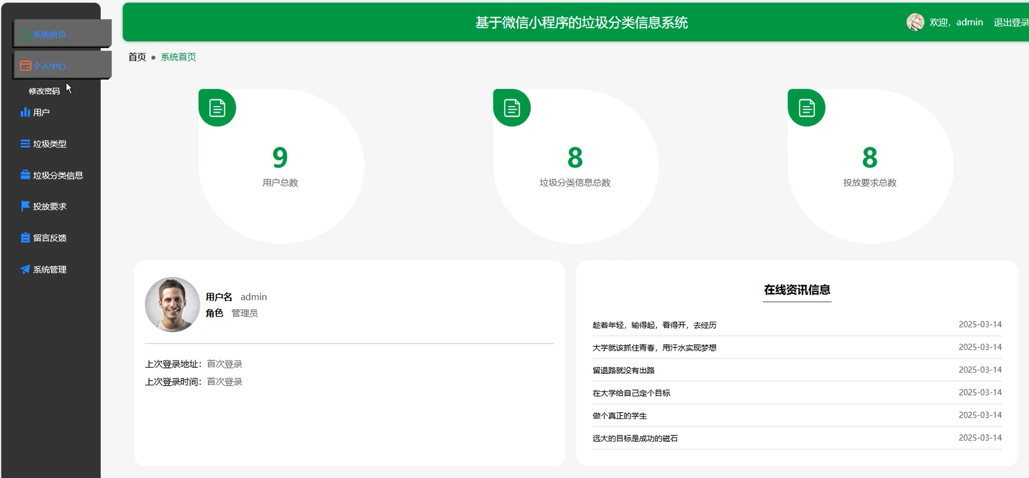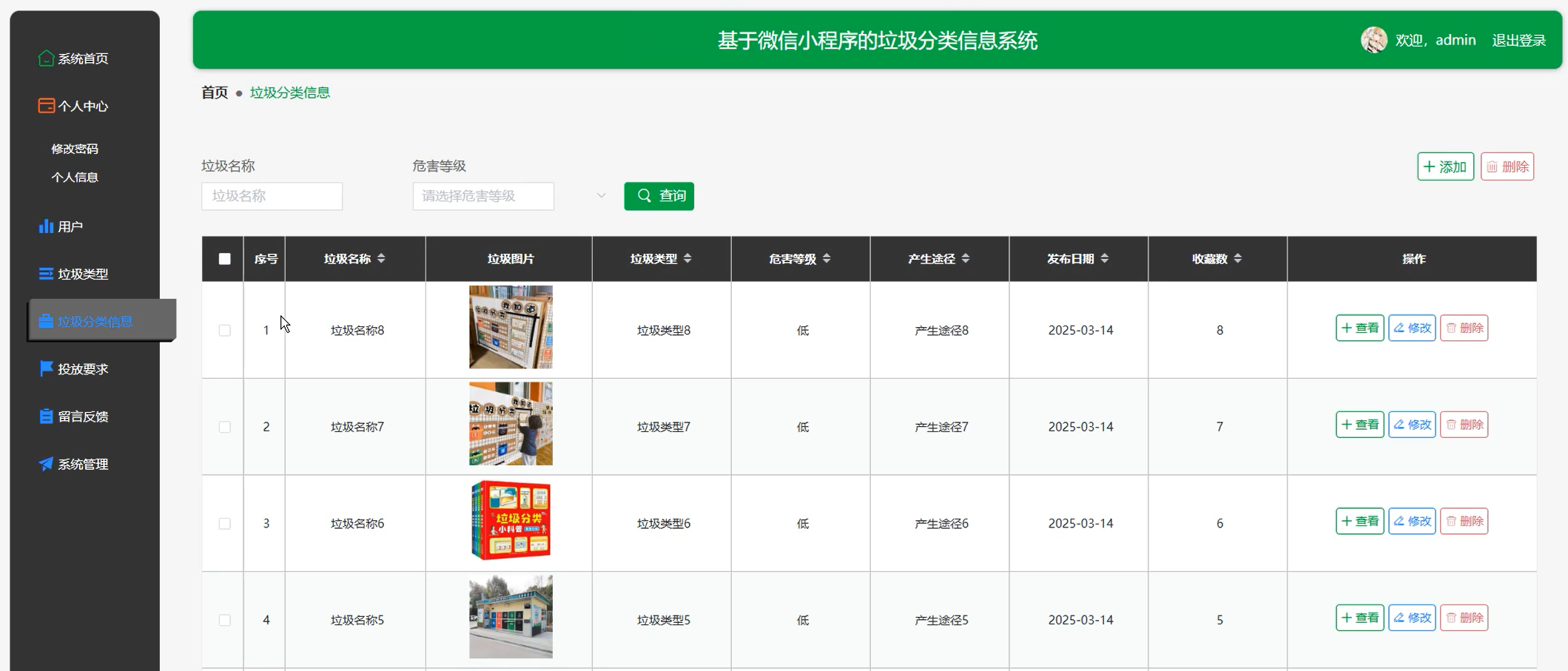 随着城市化进程的加速和人口增长,生活垃圾产量逐年攀升,传统填埋和焚烧处理方式不仅占用大量土地资源,还易造成环境污染与生态破坏。尽管垃圾分类是解决这一问题的关键,但公众认知不足、分类标准不统一、执行效率低下等问题普遍存在,导致"前端分类、后端混合"现象频发,分类工作流于形式。与此同时,物联网、人工智能、大数据等技术的快速发展为垃圾分类的智能化管理提供了新可能,通过构建基于微信小程序的垃圾分类信息系统,可整合智能识别、数据分析和公众参与功能,实现垃圾分类全流程的数字化、精准化,从而破解传统模式的痛点,推动城市可持续发展。