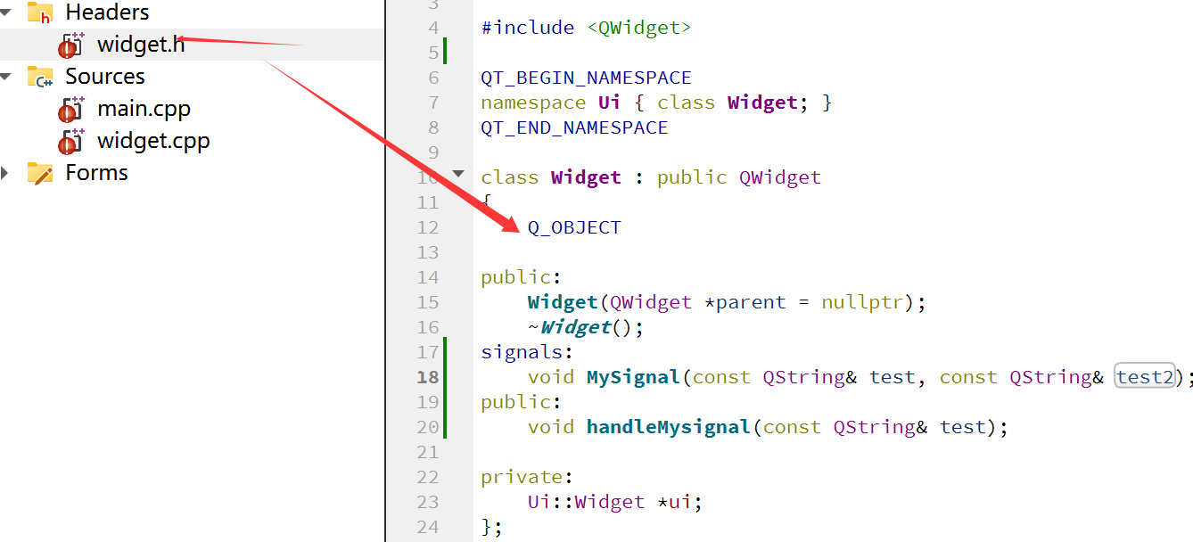 - 注意:Qt中,如果想要让某个类能够使用信号槽(可以在类中定义信号和槽函数),必须要在类最后开始的地方写下Q_OBJECT宏