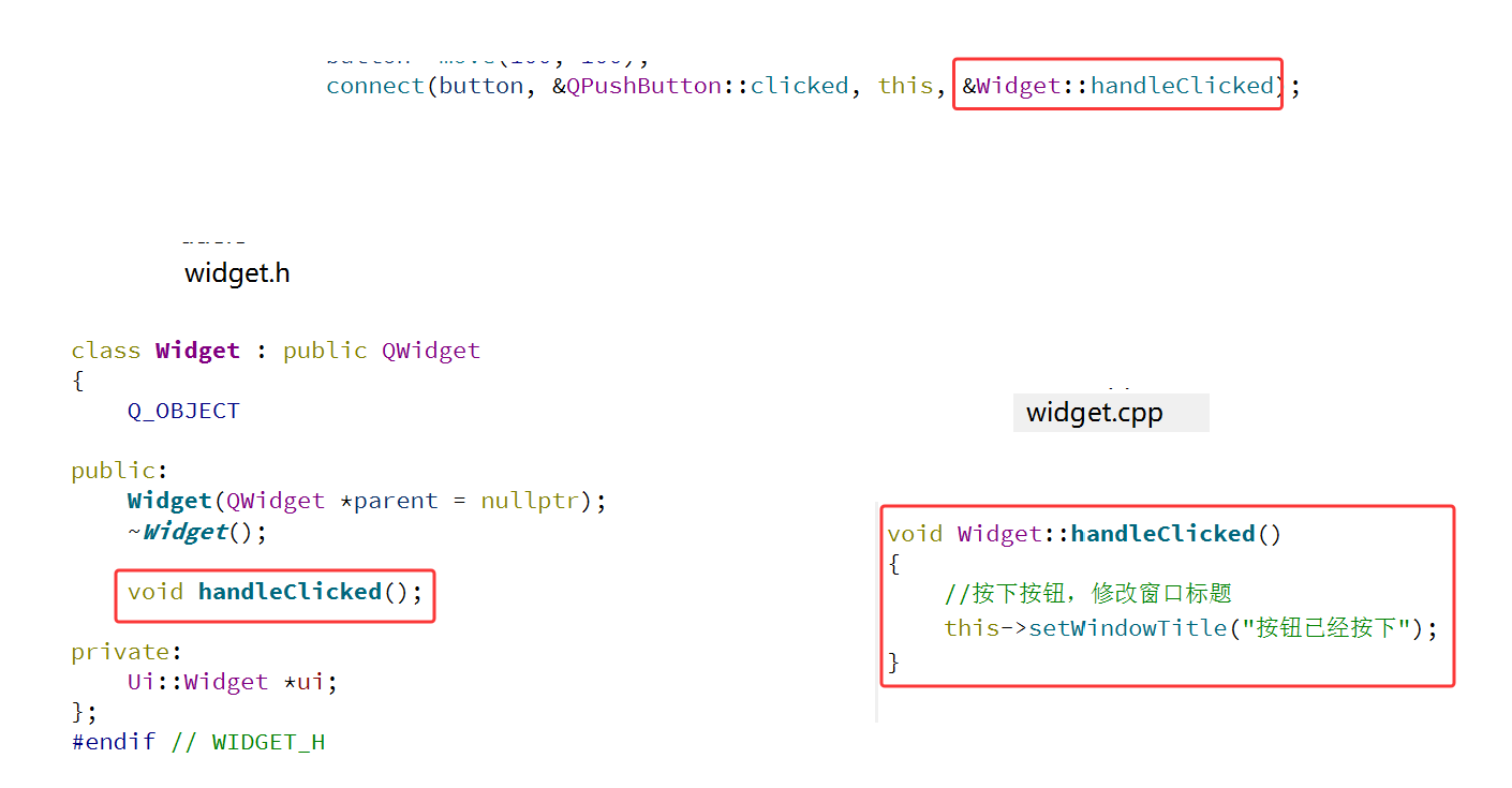 - handleClick:按钮1默认绑定的槽函数1,当点击按钮1,窗口标题修改为"修改窗口标题"