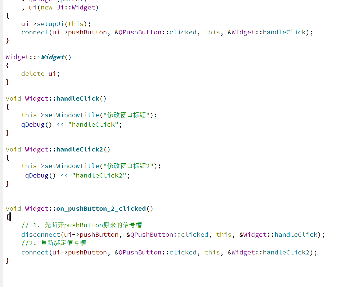 - handleClick2:按钮1绑定的槽函数2,当按钮1与这个槽函数绑定,点击按钮1,修改窗口标题为"修改标题2"
