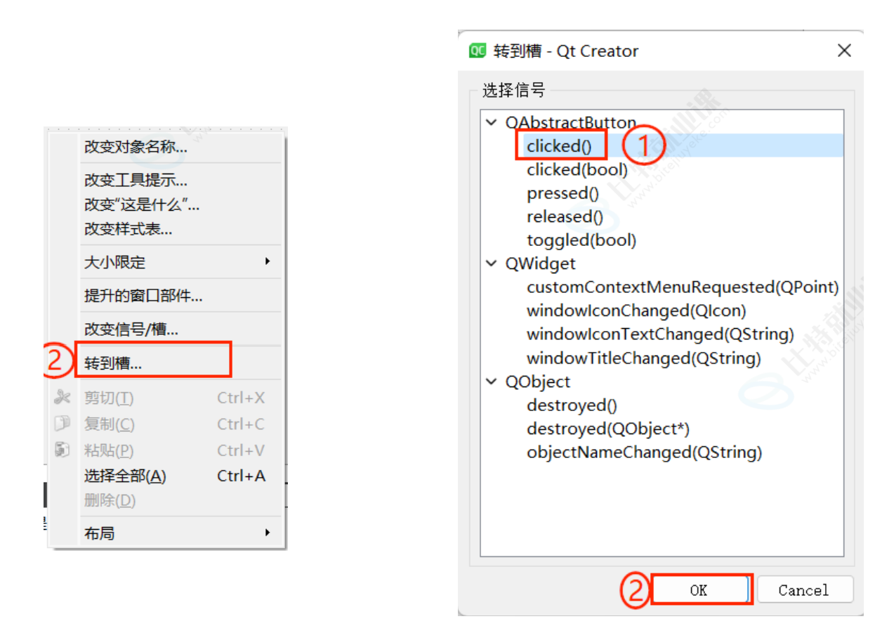 - 鼠标右击-->转到槽,可以看到窗口列出了QPushButton给我们提供的所有信号(包含QPushButton父类的信号),这里我们选择clicked()