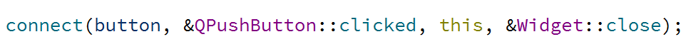connect(button, SIGNAL(&QPushButton::clicked), this, SLOT(&Widget::close))- Qt5开始对旧版本的写法做出了简化,不再需要写宏,给connect提供了重载版本,重载版本中第二个参数和第四个参数成了泛型参数(允许传入任意参数)